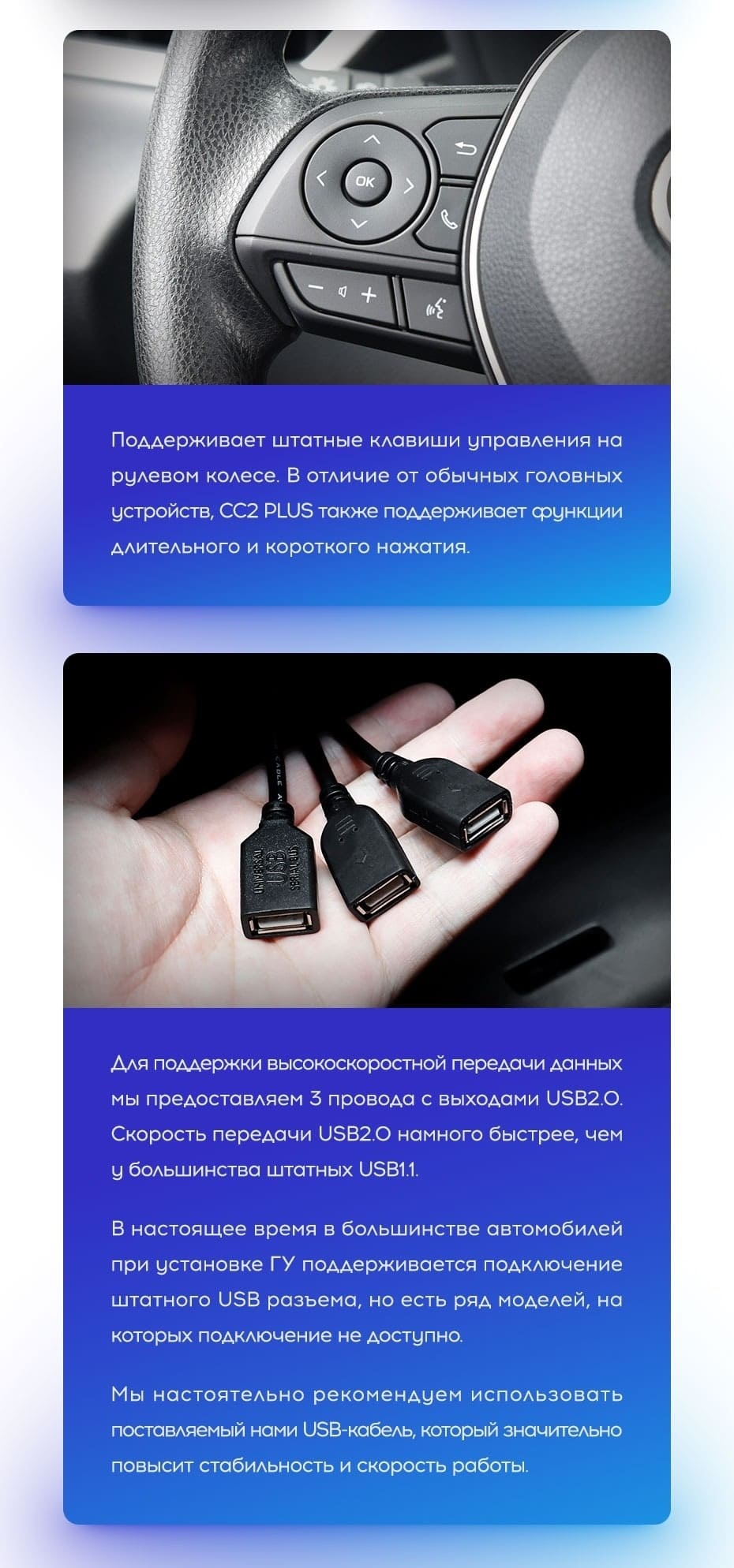 Только в линейке СС3 реализовано программное обеспечение, которое отображает трёхмерную картинку движения автомобиля. Благодаря установленному трёхосному датчику гироскопа на дисплее магнитолы отображается автомобиль в 3D-плоскости (доступны повороты 360о, динамические данные).
